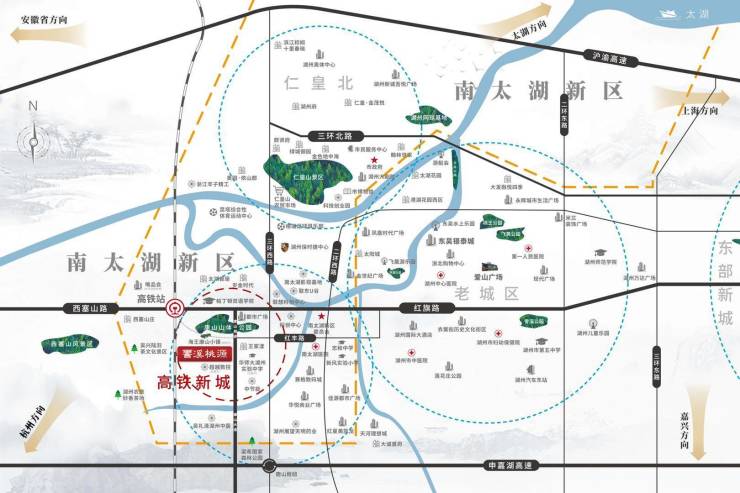 桃源里-紧邻湖州高铁站,接入杭宁线、商合杭高铁,沪苏湖线(在建)、三条高铁,通达沪苏杭宁,融入长三角“1小时交通圈”,畅享双城生活。