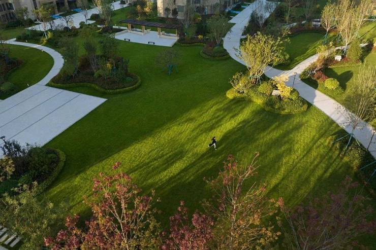 景墙背后掩映的是社区中的核心,一片宽阔的阳光草坪,在这里可以纵享春深似海之景。