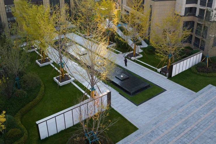 设计在此运用“留白”手法,舒展的草坪像是一颗“绿色心脏”,给予景观呼吸与透气的空间。