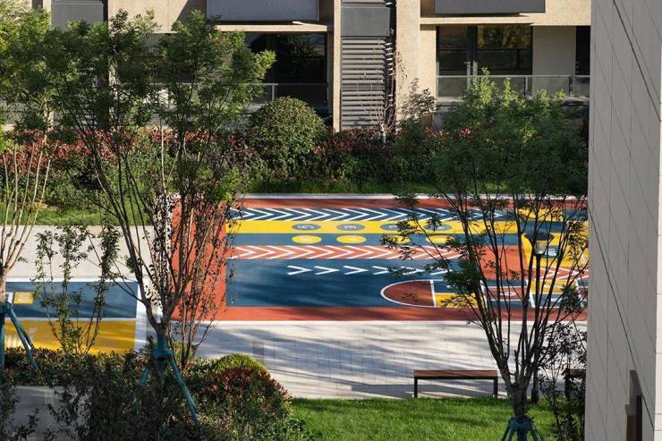 多功能全时运动区与室外会客平台也穿插在跑道之中,二者动静结合,满足着居民多样化的运动与交流需求,人们在这些地方锻炼身体,补充能量,也可以聊天交际,驻足休息,静静地感受鸟语花香。