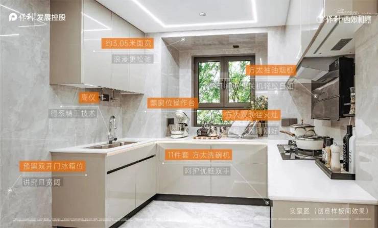 U型厨房带飘窗的设计,左侧预留了双开门冰箱位置,让整个空间的利用率更高。