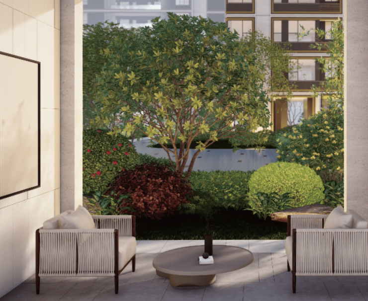 将中央绿地、行道景观绿化相结合,形成多层次、多空间的一体化系统,营造视野开阔,都市交流的生活场景,为住户提供一个锻炼,聚会,漫步,休闲的场所。于阳光草坪区域营造舒适的林荫环境,以位于林荫之下的休憩空间,缩短人与人的距离,营造陪伴氛围与浪漫典雅的园区景观。