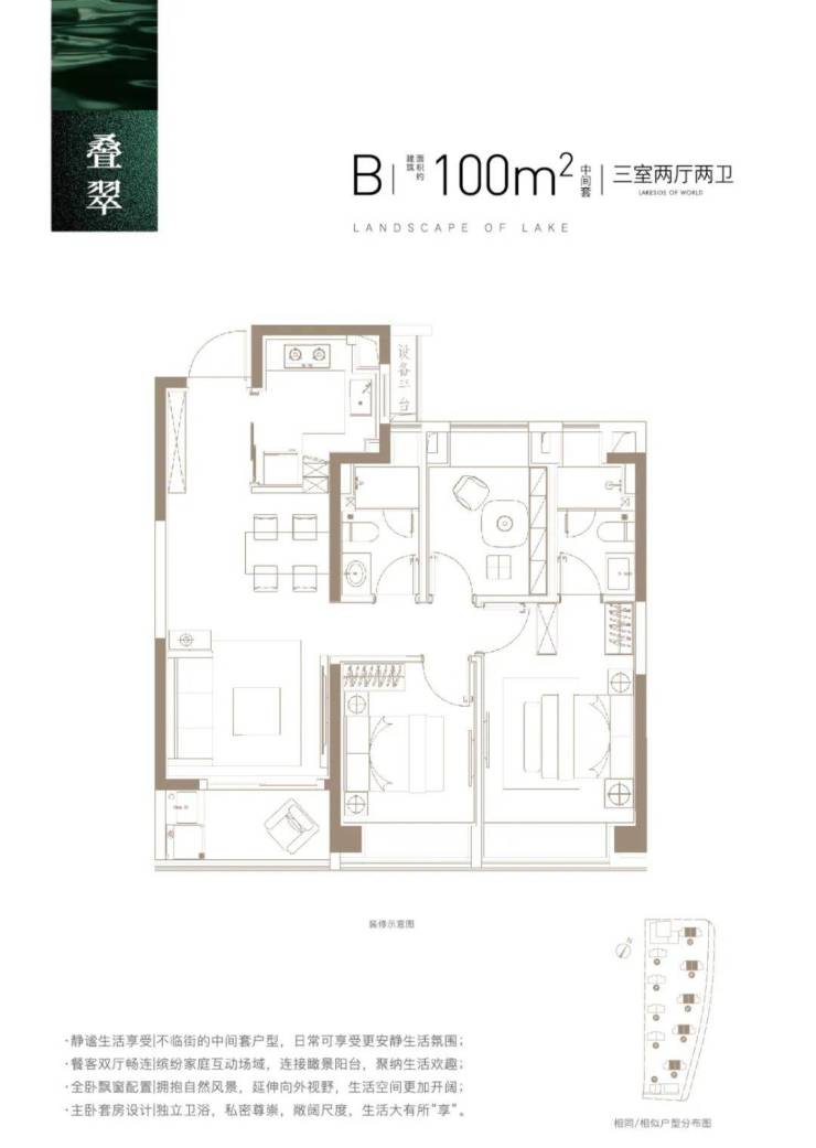 在建筑排布上,映翠府以奢阔楼间距设计,让每一个横排之间互不遮挡,每一个竖排视线错落分布,将视野让渡给自然风光,为居住者营造【风景平权】的宽境视野。