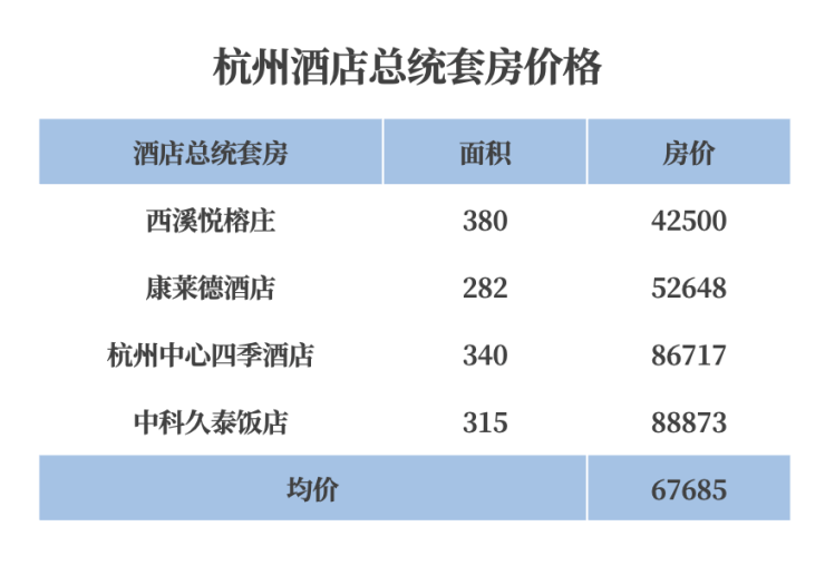 我们查了下杭州几个总统套的价格,西溪悦榕庄4.2万,康莱德5.2万,杭州中心四季酒店8.6万,中科久泰饭店8.8万。