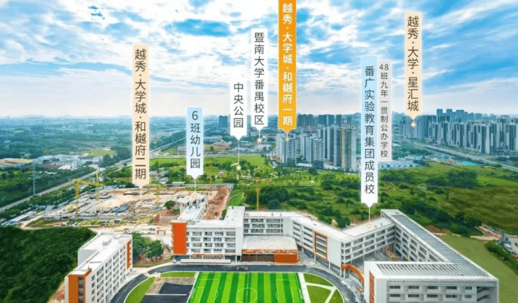 项目已经纳入兄弟小区-越秀大学城和樾府配建的九年制广大附中学校招生范围内,业主小孩可人户一致入读!预计今年9月开学,小区自身还有配建一所幼儿园,周边还有多所中学及大学围绕。