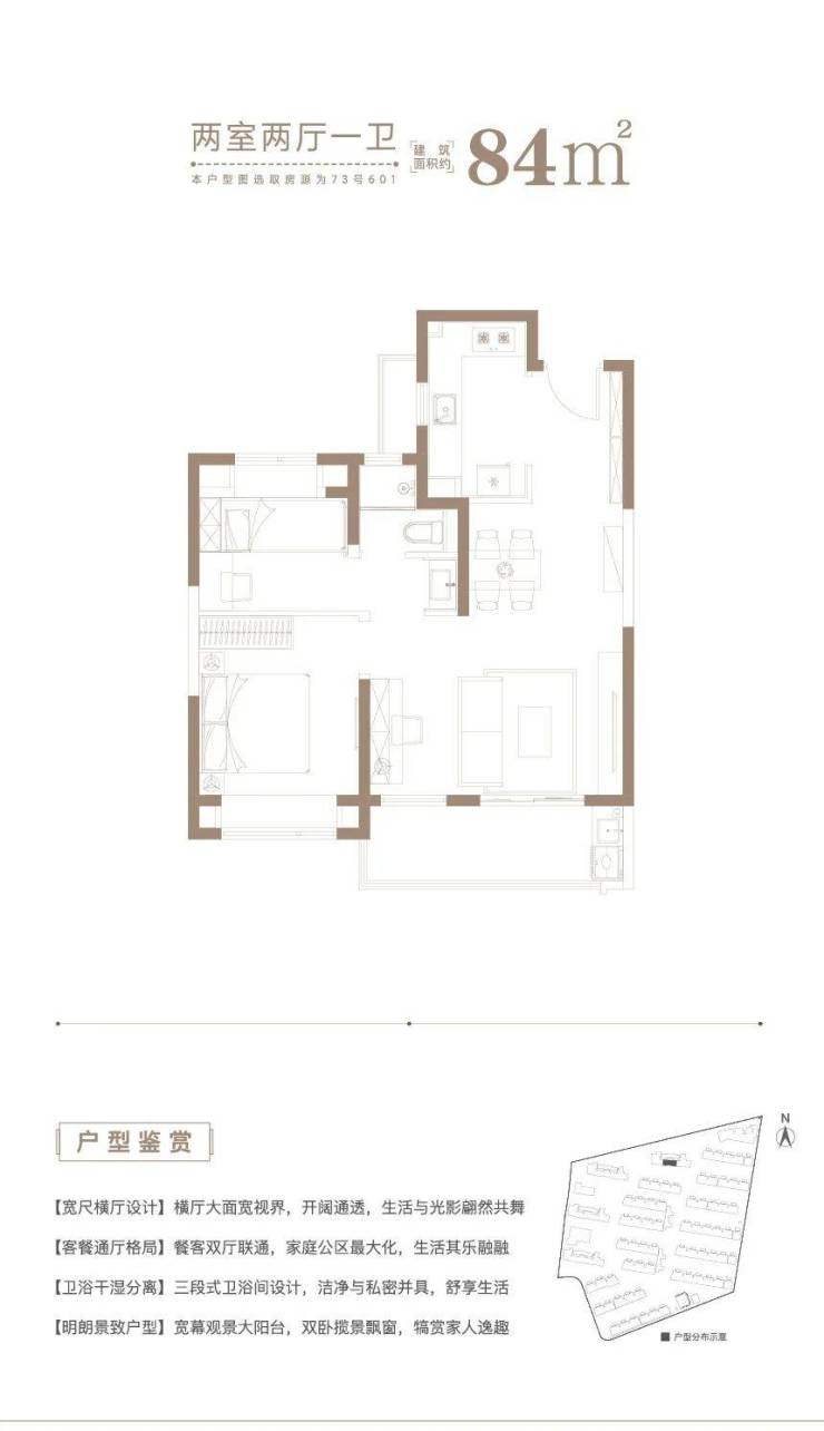 建面约84㎡2房2厅1卫户型,做到了2+1开间朝南+动静分离+卫生间干湿分离,非常紧凑的2房户型。