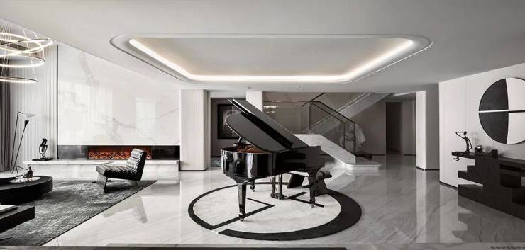 负一层设置为社交娱乐空间,在空间的中心点,以一架三角钢琴为起点,四向展开分布了不同的空间属性,这样软性的空间切割,可以缓和空间的张力,同时使空间的社交聚合得到多元性和自由度的延展。