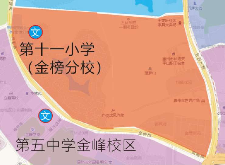 教育方面,根据最新学区划分,小学划分至 惠州市第十一小学 (金榜分校) 、初中则是今年刚开学的 第五中学金峰校区 ,周边还有惠州市外国语学校、惠州市实验中学等,且小区配建有幼儿园,书包的问题不用担心。