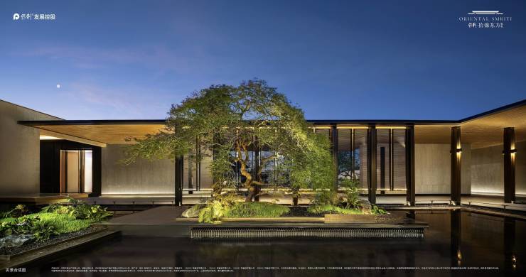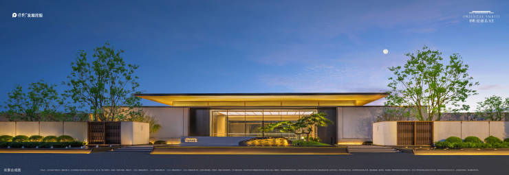 尊崇礼仪门堂,约40米宽重工门头,再现中式府邸门庭风度;楼栋建筑采用江南飞檐的技法,勾勒屋檐舒展平远的姿态;镂空金属、木纹铝板、错缝石材拼接,演绎山水纹理,隽永美好。