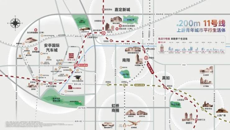 嘉定新城立足打通长三角一体化和虹桥国际开放枢纽的链接通道,构建“一核一枢纽、两轴四片区”的规划新格局。“一枢纽”即安亭枢纽——以安亭北站、安亭西站为核心,无缝连接虹桥国际开放枢纽,打造站城一体化、辐射长三角的综合交通枢纽。(信息来源:《嘉定新城总体城市设计》)除此之外,上海 2035 规划中的宝嘉线、嘉青松线即将启动,嘉安高速延展嘉定向东,与宝山互通,以安亭为枢纽核心,嘉定再次站在了时代发展的风口之上。