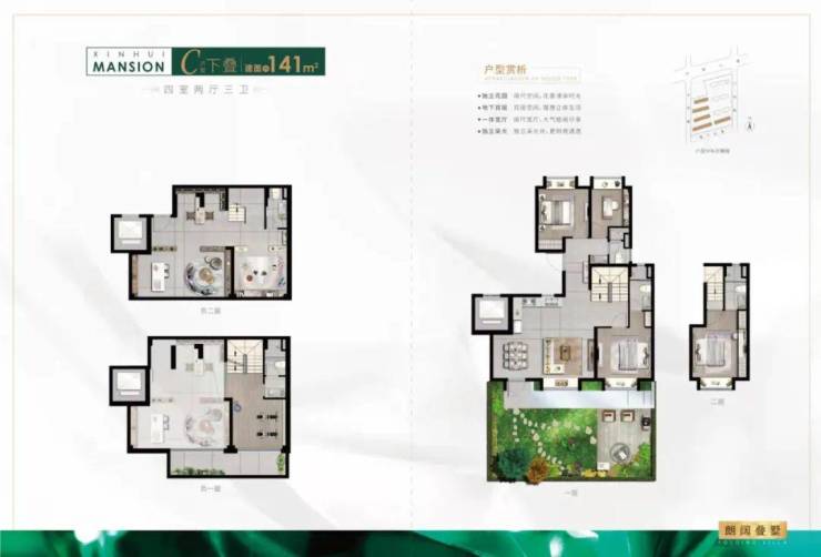 1复2的134㎡底叠户型,地上四房两厅三卫