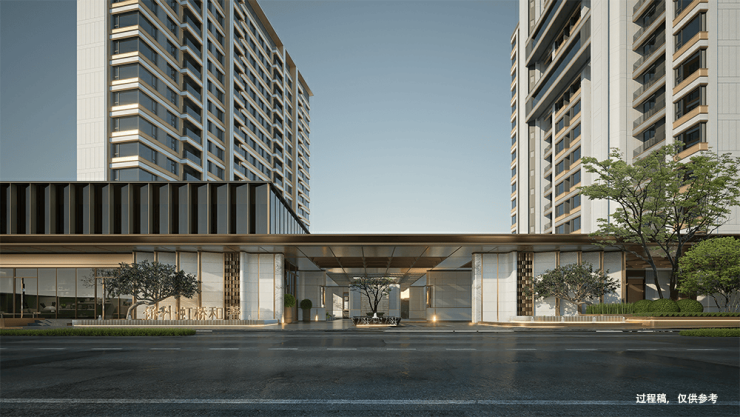 社区拥有约100米精奢门仪,臻选贝金米黄石材打造,彰显出尊贵的归家礼序,让业主每一次回家都充满仪式感。