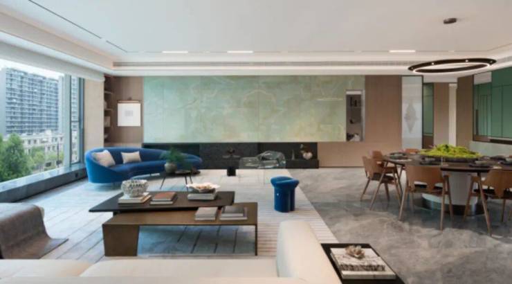 琚宾还有另一项绝活:对于材料与色彩有精妙的控制力。在T-ONE潮博东区的建筑面积约365平米户型中,他对材料与色彩的这种精妙控制力,给室内空间带来了奢侈品级的辉光。