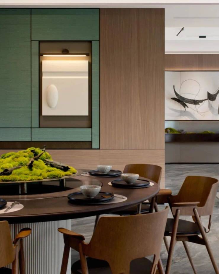 他从《西湖清趣图》中选取了11种色彩,让整个空间弥漫着雅致的宋韵。餐厅的背景墙用的是皮革编织,他选了一款非常特别的色彩——中国传统的「梧枝绿」。嵌入手工锻造的金属后,墙面仿佛成了蒙德里安的一幅画作。
