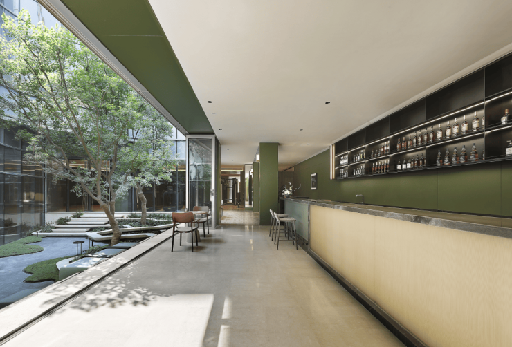 他在T-ONE潮博西区的大堂里嵌入了一个下沉式露天花园,用几株乌桕来显现四季变化。用一条回廊让室内恒温泳池、酒馆式吧台、健身房、瑜伽室等空间像行星一般围绕着露天花园。