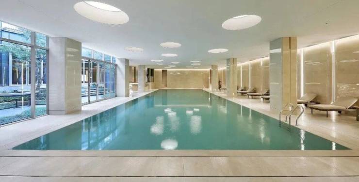 室内恒温泳池的落地门窗,可以局部打开;泳池对面的酒馆式吧台,也可以把落地门窗全部打开。这样一来,泳池、露天花园与吧台就交织成一体。露天花园里的阳光或雨露,变成了泳池与吧台触手可及的风景——大自然就这么奇妙地被设计师浓缩在你身旁。