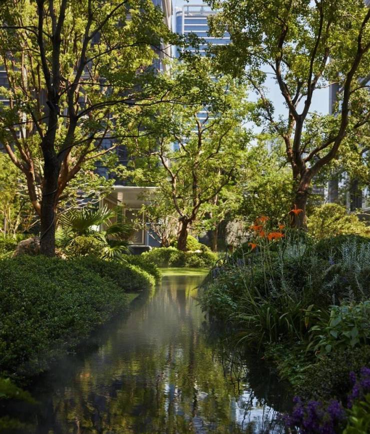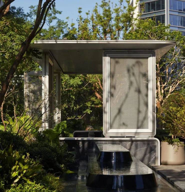 走入T-ONE潮博西区的园区,可以看到一条蜿蜒的水系串联着不同场景,贯穿整个楼盘。在这里,Pok是结合了杭州「钱塘江潮」的在地文化,用溪流与叠水打造出了一座很有度假感的花园。花园中,凡是有户外座椅的地方,就会有微风、树荫与水流的环绕。