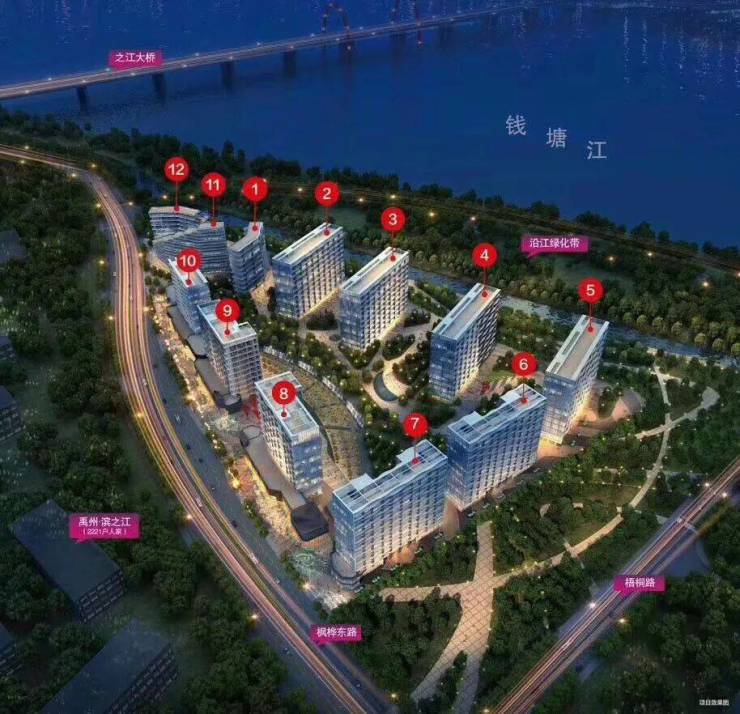 择址杭州西湖区之江度假区核心沿江宝地、西湖南片、之江南侧与“国际滨”隔江对望。 12幢12-17层板式建筑组成,东揽钱塘江浩瀚一线江景,举步沿江公园,365天尽赏天下奇观“钱江一线潮”; 23.4万方建筑体量,自带重餐饮商街、购物中心、文化、艺术、休闲、健康等功能一体的全能江湾 生活体系。