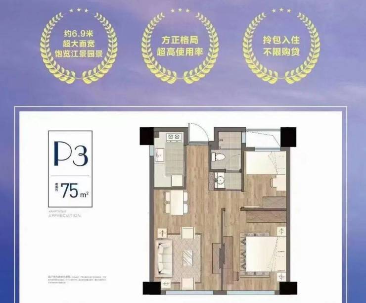 每一个户型都凝聚了开放商的匠心巧思。99㎡户型做到了三开间朝南的黄金格局,9.7m超大瞰景面宽。每个清晨被阳光叫醒,江风穿堂而入,满满的幸福感。