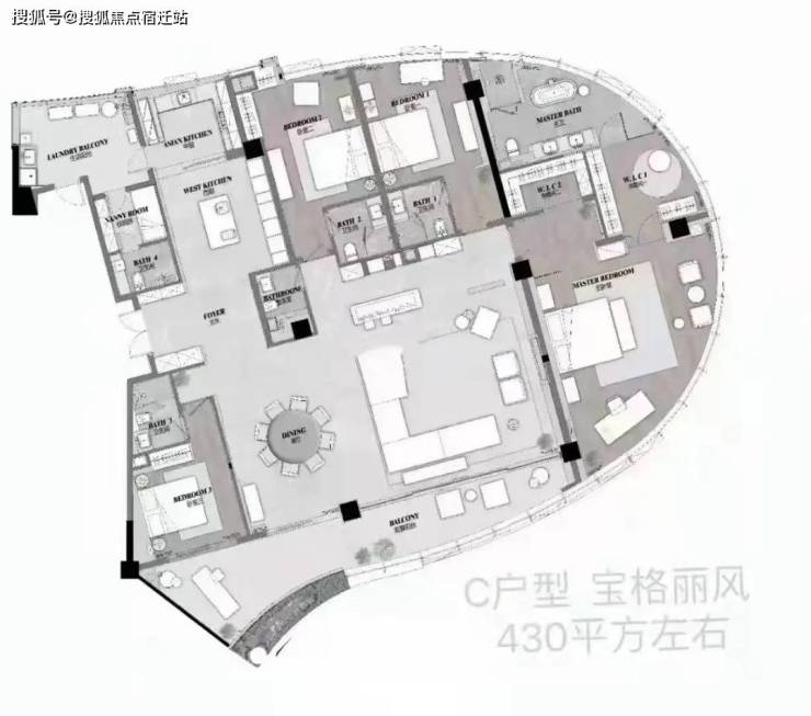 项目以三叶草为建筑原型,这样的建筑设计也造就了每户270度的环幕都市景观,较高的窗墙比为室内提供大尺度的采光面及通透感,阳光如流水般倾泻。