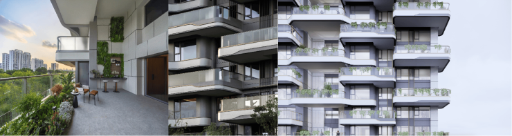 项目分为9幢23-26层住宅高层,及3栋商业和配套⽤房。