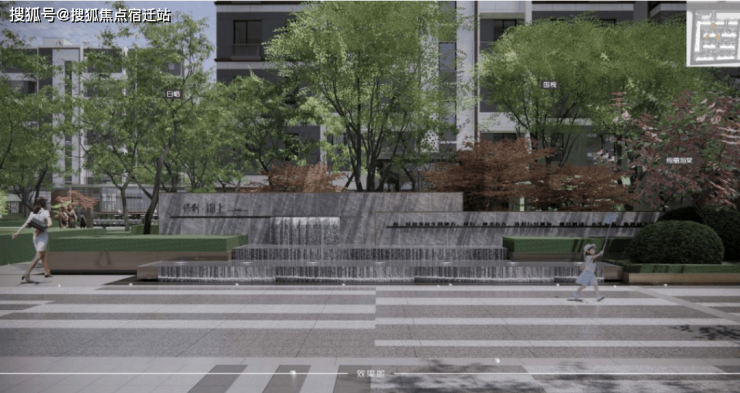 北入口进入社区的景墙,调整了出水叠瀑的出水口的大小,充分考虑水的张力修正了效果图夸张的部分,按照效果可实现的方式进行了调整,同时增加了不锈钢花池的竖向纹理细节,增加了水景的精致程度,并在立面上利用材质和肌理的变化增加了片墙的质感。