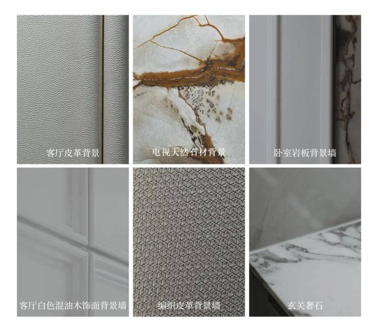 背景墙比别人更多一点。天然石材的电视背景墙,高级大气;编织皮革的客厅背景墙,充满质感;过度用的是白色木饰纹的背景墙,简约耐看;餐厅处又是白色皮革背景墙,大方优雅。整个空间过渡自然,增加了层次感和高级感。