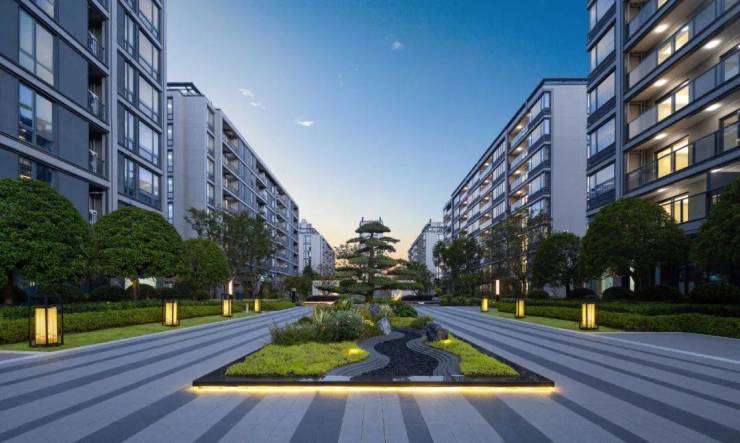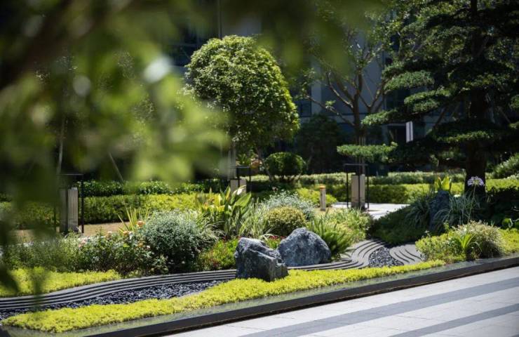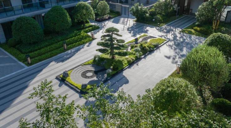 中轴对称的景观,营造出满满的归家礼序。步入园林内,一棵枝形穹峻、造价高昂的罗汉松率先映入眼帘,雅致的姿态,随时欢迎每一位归家的业主。而与其互相映照的,是一段六面屏风组成的景墙,透而不露的风雅,营造出一幅禅意十足的现代山水画卷。让置身其中的人都不禁感叹:实景比效果图更惊艳!