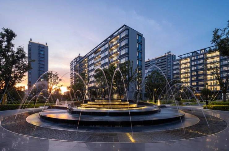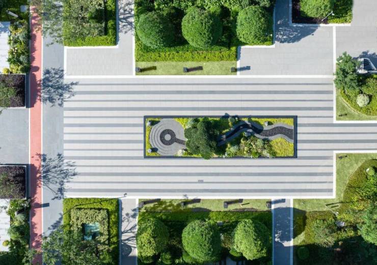 园区内即使是一棵树、一处造景,都颇有讲究,例如中央景观轴上的“日月同辉”景观水景,俯视而看的灵动形状,寓意日月辉映下的美好生活,成为了园区的点睛之笔,而蓝天下跃动的水波,更使园林有了“天光云影共徘徊”的浪漫惬意。