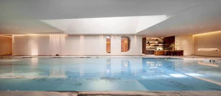 游泳池以罗马会场泳池为灵感,汲取《观瀑图》的山水意境,将古典与现代完美融合。池畔以大理石铺就,线条优雅如古罗马建筑的恢弘气势,而池中水波粼粼,光影交错间,水幕如瀑,营造出“人在画中游”的诗意境界。