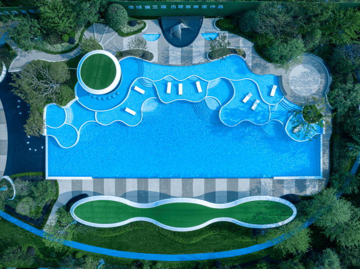 汲取新加坡“圣淘沙”泳池灵感,将建筑极简、纯粹的元素融入泳池设计之中,巨资打造约870㎡无边际叠水泳池,景观水面层层叠水,曲水律动与花园景致融为一体,玻璃围墙呈现无边际泳池般的通透感,营造出宁静自然的高端酒店式度假氛围。