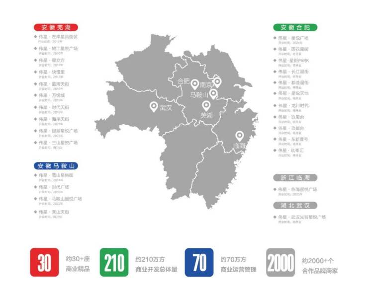 ✮伟星商业,11载踔厉奋发,不断扩大商业宏图,足迹遍布芜湖、马鞍山、合肥、南京、武汉等城市,打造约30+座商业精品,成功开发约210万方商业总体量,高效运营达70万方,始终走在商业地产开发前端,成为了行业翘楚。
