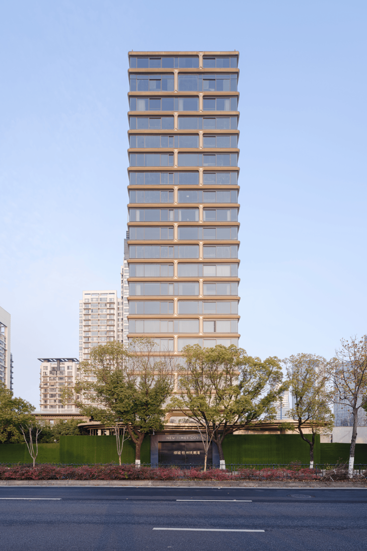 立面设计:金色铝板曲面线条+大面积玻璃幕墙,灵感源自钱塘江潮涌,获Architizer A+Awards全球建筑奖提名[[3][5][6]]。