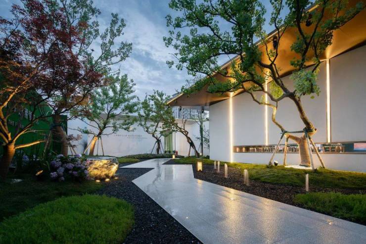 入口处门廊顶星光点点辉映。在空间的处理上,设计团队采用对称式的布局方式,景墙采用纯净大气的墙面,内置金属格栅,虚实相映。阶梯式入口草阶景观,视野开阔。整个入口空间形成大尺度的延长展示面,打造简约大气而又不失仪式感的第一进迎宾景观空间,并且作为导入空间也为后续景观向内延伸起了铺垫作用。