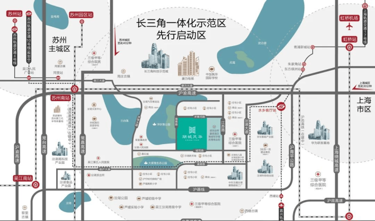 苏州南站(汾湖站)位于长三角一体化先启区——汾湖,沪苏湖铁路、通苏嘉甬城际高铁于此呈“十字”交汇,其中沪苏湖铁路由上海虹桥枢纽引出,途经上海松江、苏州吴江,至浙江湖州站,通车后将实现由汾湖8分钟到松江,20分钟到达上海虹桥枢纽,将汾湖与上海更紧密的联系在一起。