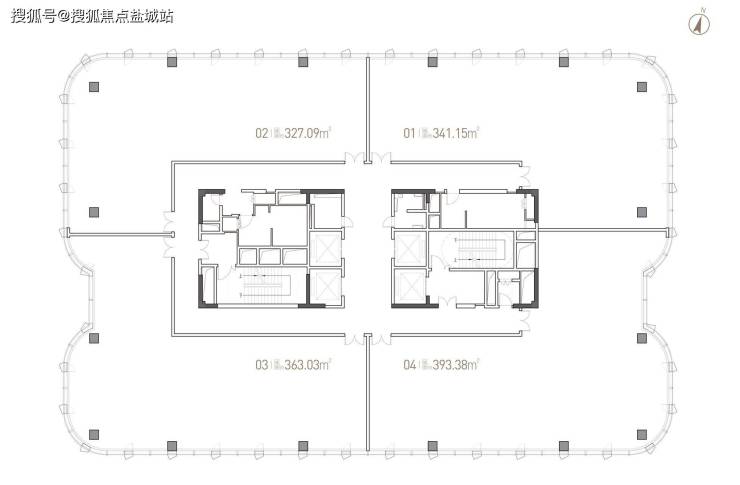 标准层分割面积:建筑面积约327㎡-约341㎡-约363㎡-约393㎡