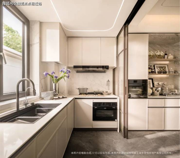 比如,厨房和餐厅中间用 无地面链条设计的海派金属玻璃移门 隔开,地砖能通铺更美观,也方便扫地机器人通扫全屋。同时还标配中西双厨。