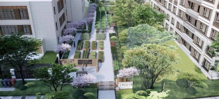 约500米活力环跑道,串连禅意花园、跌瀑水景、康养花园等多级景观节点。精配儿童乐园、社区农场、记忆大树、探索乐园等亲子互动空间。