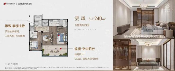 二层雅致套房,设独立衣帽间与卫浴系统,主卧连通转角大阳台,观景静度,皆优雅舒适;南向舒适功能次卧,既满足家族同堂之乐,亦为待客休憩预留空间。