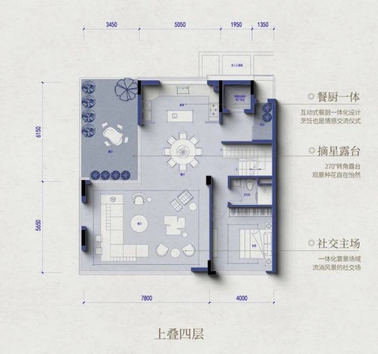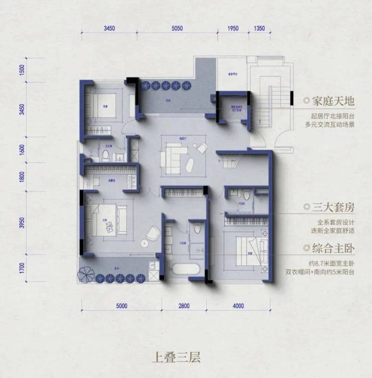 ③南向大面宽:在绿城的低密产品研发中,「南向大面宽」拥有非常关键的研发优先级。建筑面积约295平米的上叠户型与建筑面积约275平米的下叠户型,都拥有奢侈的约11.8米南向大面宽,每一个客餐厅、卧室套房都拥有更敞亮的采光与视野;客餐厨LDK一体化的设计,更是让叠墅的室内空间拥有与大平层一样的通透感。他们还在卧室套房之间设计了一个与阳台交融在一起的起居室,这里可以是你们家的公共书房,也可以成为卧室旁的兴趣空间。