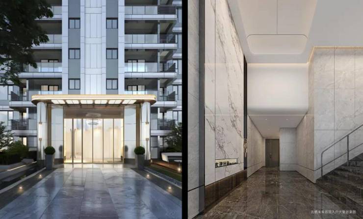约4.6米挑空大堂,香槟金铝板与学府灰真石漆搭配,岩板与金属材质辉映