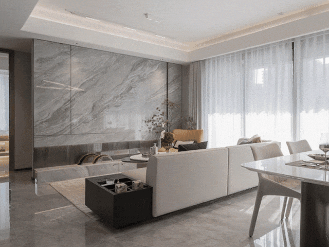 中央空调、新风、地暖等,宽幅墙布,并标配了双背景墙(岩板+金属线条的电视背景墙、皮革硬包+金属线条的主卧背景墙)。