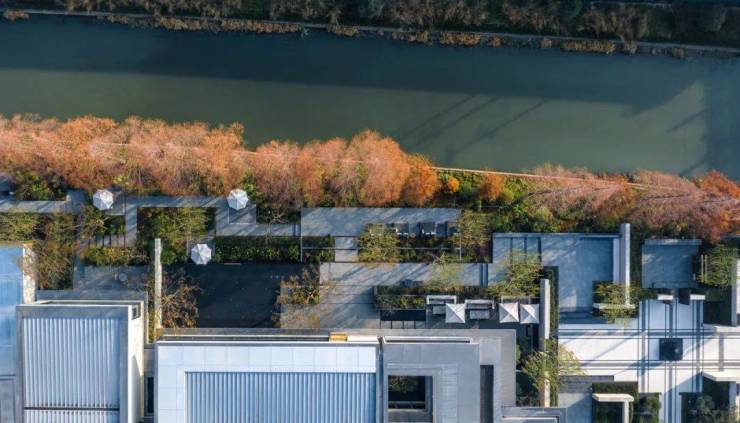 整个社区被一个T字型的水系贯穿,让社区的每一户都能看见河景,依水而居,静谧私密。
