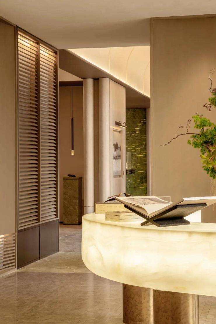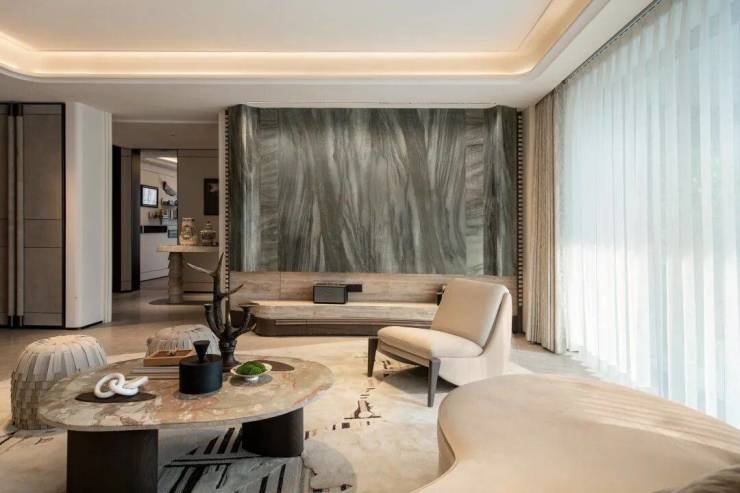 最大建面约260㎡户型则通过超白洞石、艺术漆、木饰面、木纹岩板和皮革包边等,经过数轮景观打样,最终呈现出漆砚的温润质感。