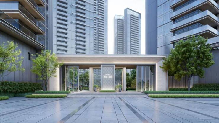 约9米高爱马仕灰高端石材社区大门,搭配大面积通透玻璃及中轴铝合金造型,尽显简奢时尚的格调;超高酒店式入户大堂,堂皇而细节考究,予业主一场尊崇的归家仪式。