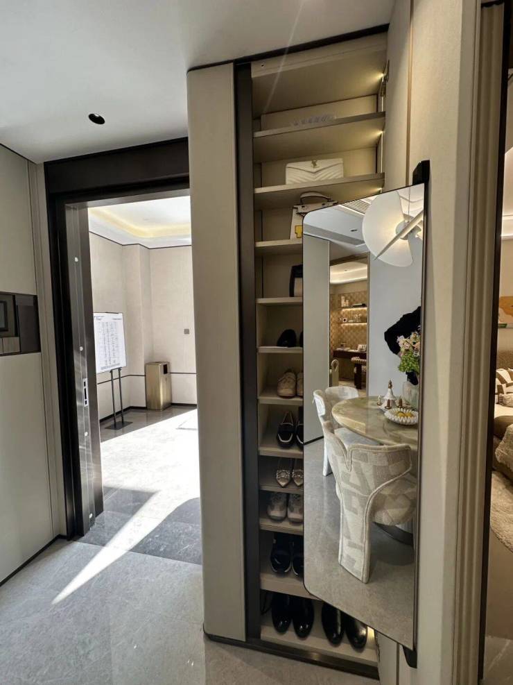 你惊喜于项目满配的收纳哲学,入户就打造了大面积的收纳窄柜,便于日常存物和囤货;玄关鞋柜分区精细,附带穿衣镜,完全胜任次净衣区。