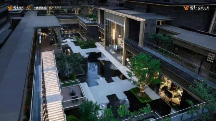 首先就是小区大门,大门景墙采用顶级爱马仕灰石材与复古香槟金属线条衔接,正中间的水景之上,有一“大鹏展翅”造型雕塑,整体看起来尊贵大气。其次是下沉庭院,1200㎡的下沉确实不多见,但主要还是看下沉里有什么?北侧有一水晶流瀑,流瀑高约11米、宽约14米,精品丛生乌桕,与镜面水景相呼应。