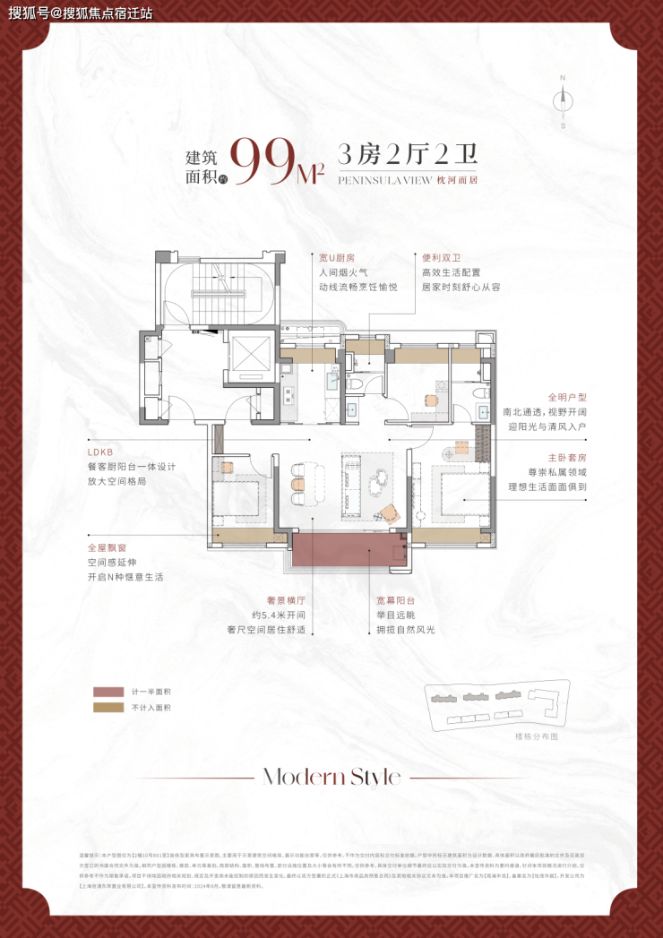 ①三开间朝南是基础,约5.4米的大宽厅才是亮点!除了带来更充沛的采光和更宽幕的视野,也让餐客厅阳台融合成大尺度方正公区,大宅气度油然而生!