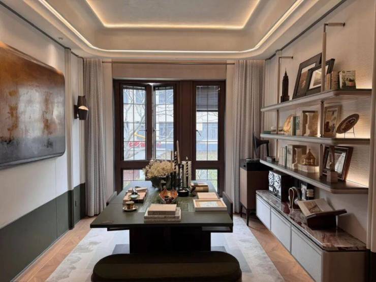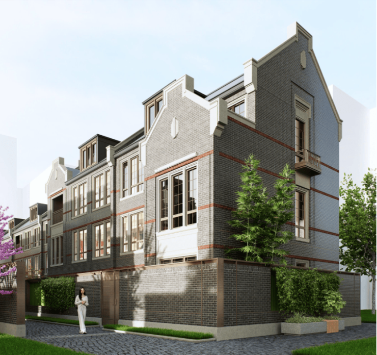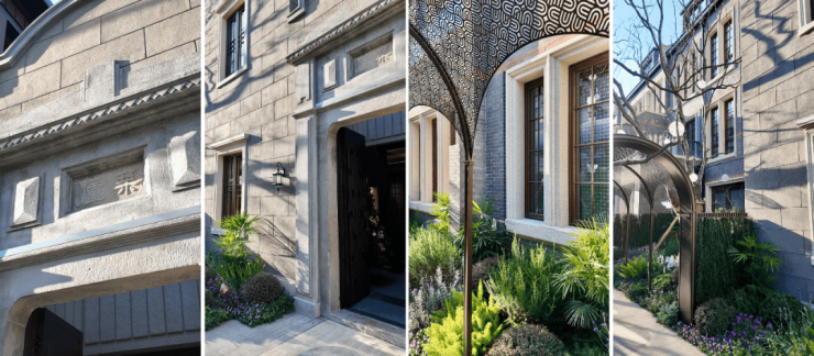 风貌别墅延续了上海石库门风格。青砖黛瓦,红色腰线,南向面宽最大的大概约15米左右。从一扇门、一扇窗中保留和创新,同时区别“里弄式”别墅的小格局、少采光、多浪费;空间布局灵活,满足不同高阶家庭生活需求,递呈出静安苏河畔难得的海派浓荫别墅。