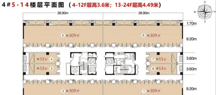 4号楼写字楼 :约53、309、617㎡(层高4.49米)单价:1.2-1.4万左右